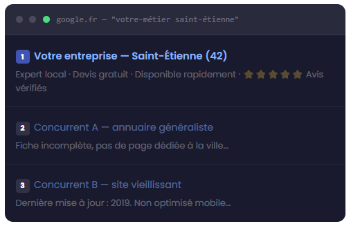 Quand quelqu’un tape « plombier urgence Saint-Étienne » ou « coiffeur quartier Bergson » sur Google, les premiers résultats raflent 90 % des clics. Si votre site n’y est pas, vous n’existez pas — peu importe la qualité de votre travail.